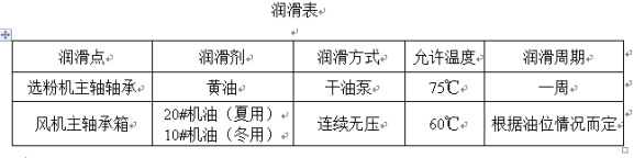 在日常運行中,應(yīng)保證各潤滑點充分潤滑,并定期對粉分離器內(nèi)軸承和風(fēng)機軸承進行潤滑(見下表)。在日常維護中,注意粉體分離器轉(zhuǎn)子的平衡。如發(fā)現(xiàn)異常振動,應(yīng)立即停機檢查原因,并可在運行前繼續(xù)故障。